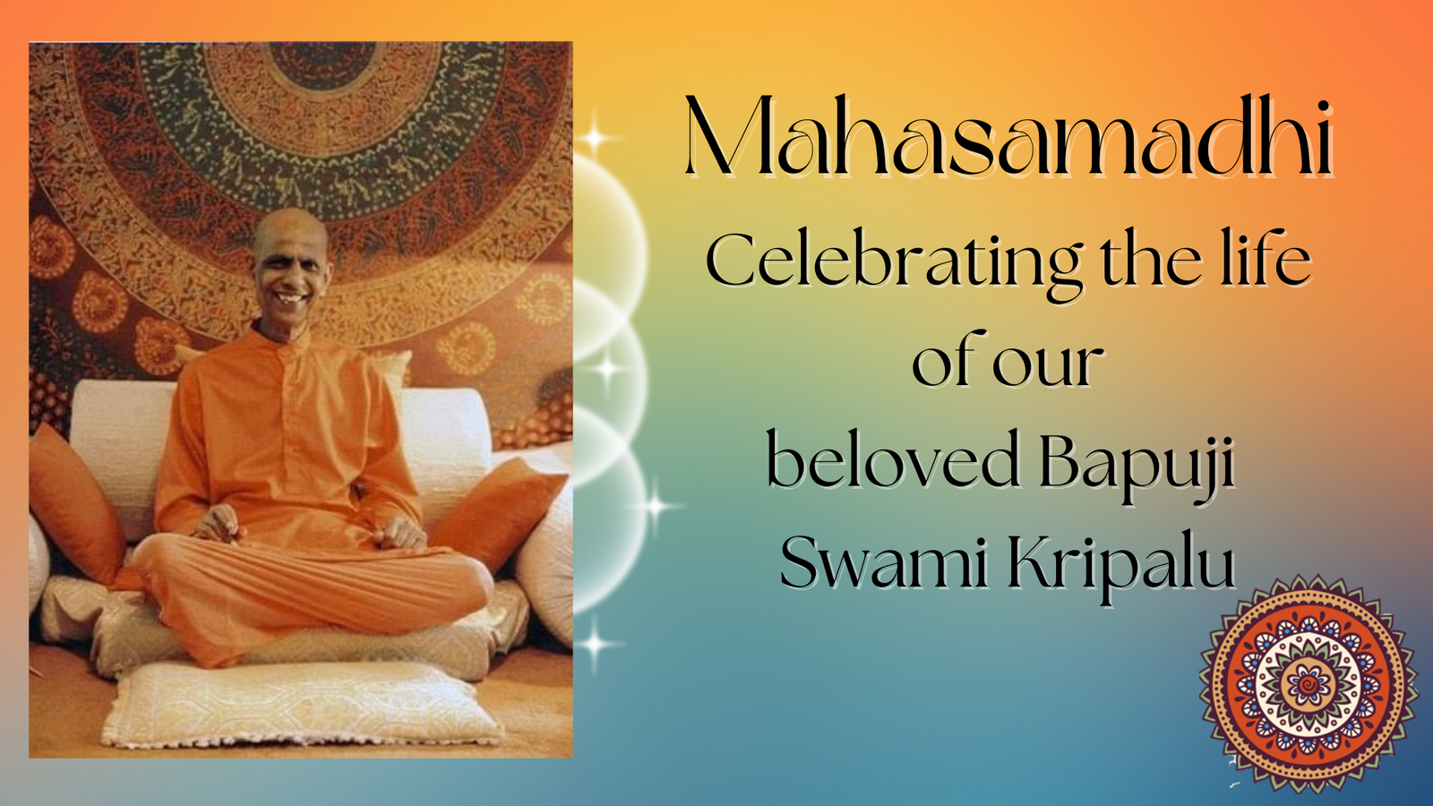 Mahasamadhi is 2 sanskrit words (Maha = great) + (samadhi = deep integration), together referring to the death of a spiritual being - Swami Kripalu's final deep integration. He's called a Swami because he took vows to renounce a worldly life, similar to a monk in the West. This event is an annual opportunity to remember Swami Kripalu's passing (on December 29, 1981), this year we're celebrating on the date of his birth (on January 13, 1913), and each year it's a chance to learn about and revisit his teachings. Since now there are so many ways to practice and study yoga in the West, we offer this annual event as a chance to embrace yoga's roots as we highlight and uplift the original words, wisdom, and gifts of a yoga master from India.